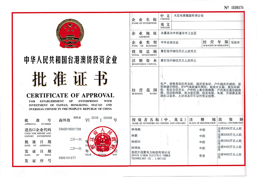 熱烈祝賀大亞電器集團(tuán)有限公司已被批準(zhǔn)為中外合資企業(yè)
